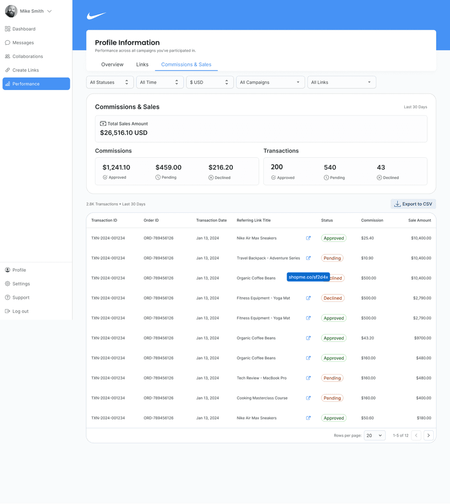 This tab answers the top support question: what got approved, what’s pending, what was declined. A summary band shows Total Sales for the period, then three cards break down commissions by state. The table lists transactions with status chips, order IDs, referring links, and amounts; exports match what’s on screen.