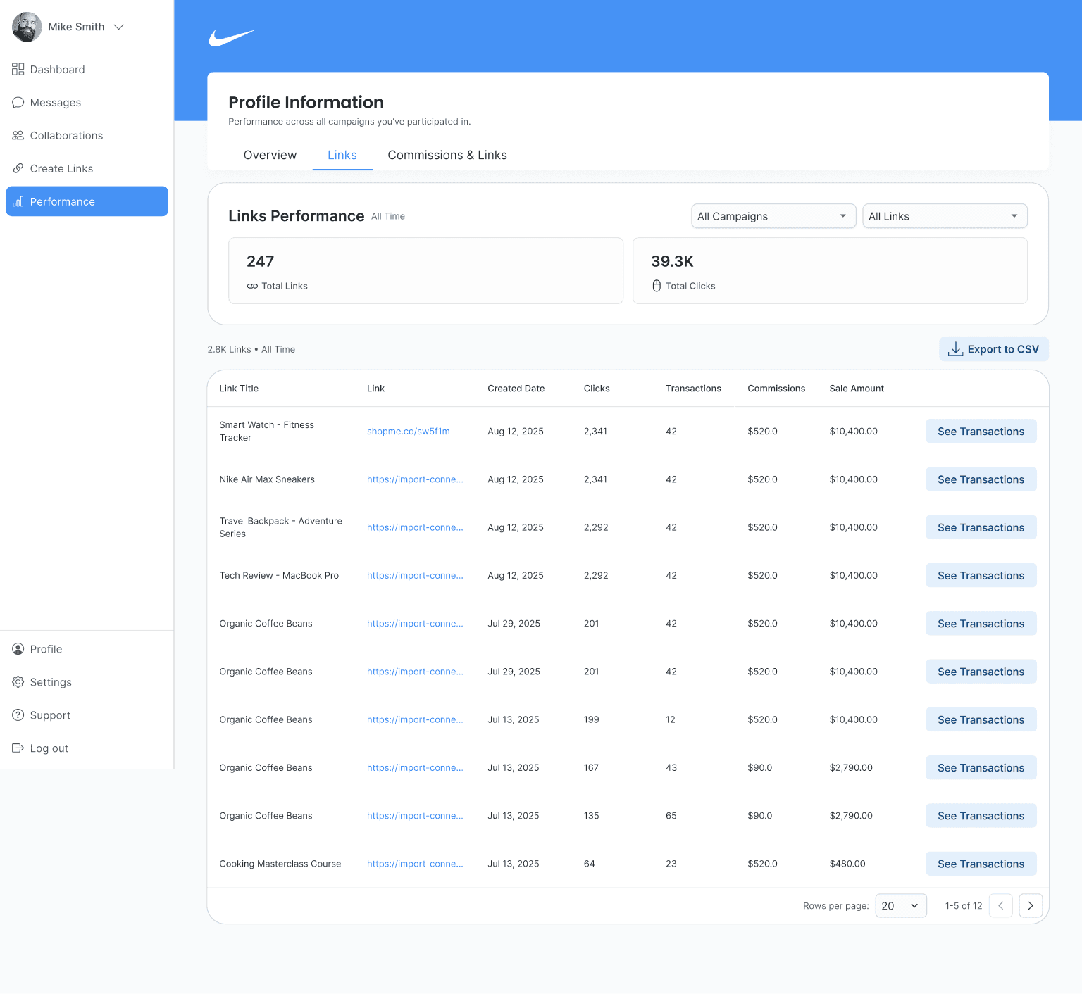 The Links tab lets creators filter affiliate links by date, clicks, transactions, commissions, and sale amount. Top-level counters show Total Links and Total Clicks with filters for campaign and link type to narrow scope quickly. Each row has a button to display transaction details, and CSV exports respect current table filters. On mobile, the display uses the same model with stacked cards for legibility.