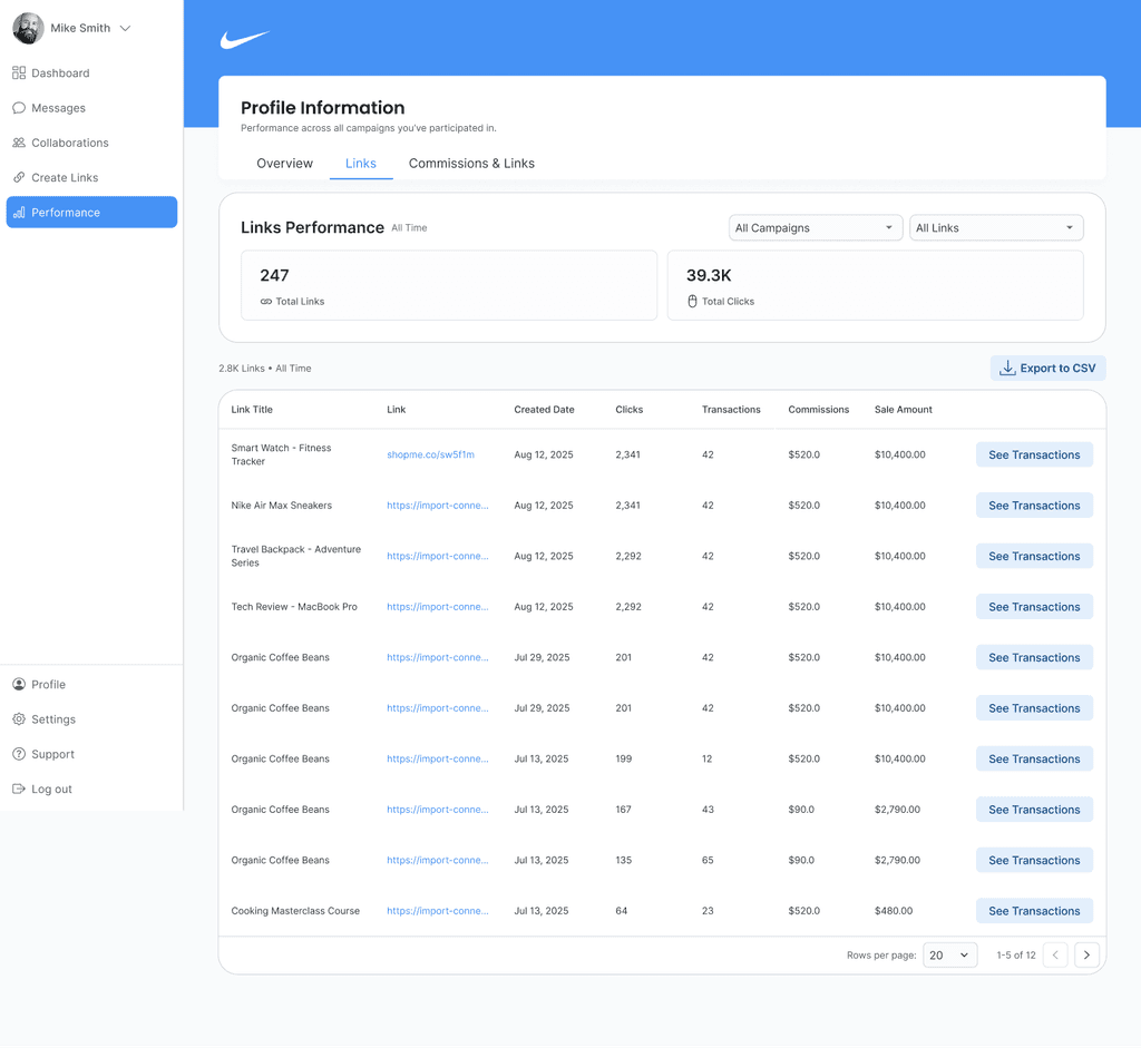 A sortable table lists every shoppable link with created date, clicks, transactions, commissions, sale amount. Counters show Total Links and Total Clicks; filters for Campaign and Link type narrow scope quickly. Each row has See Transactions for detail, and Export to CSV respects current filters.