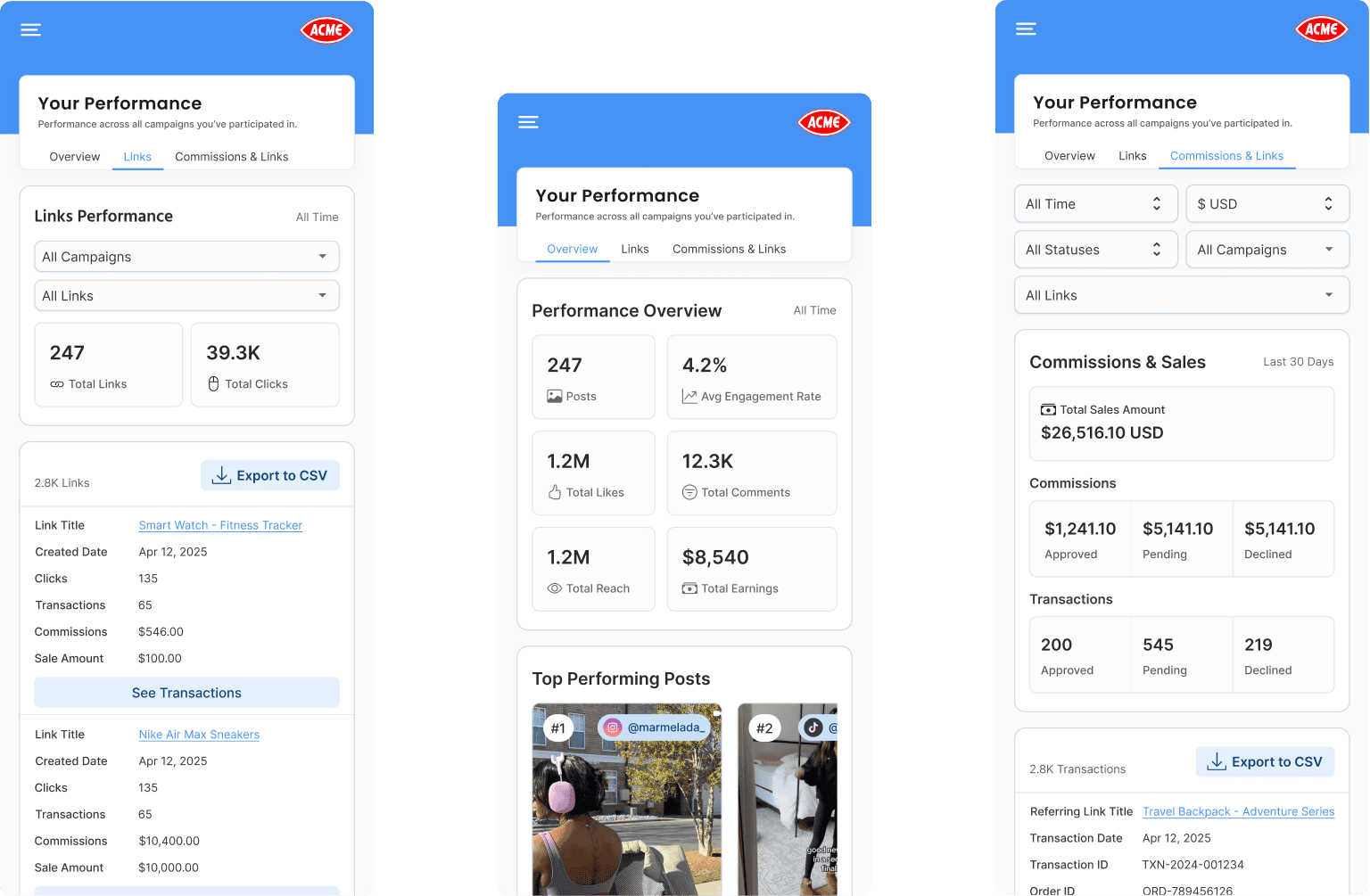 Creators come to CreatorIQ with simple questions: What worked this month? Which links drove sales? What actually got approved? Before, this information was siloed in different pages with different labels, forcing creators to piece together results from social analytics, affiliate dashboards, and their personal inboxes. The process was confusing, frustrating, and inefficient.