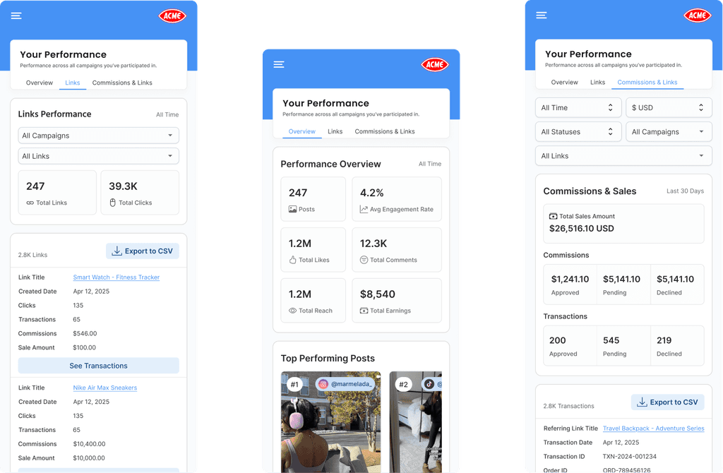 Creators come to CreatorIQ with simple questions: What worked this month? Which links drove sales? What actually got approved? This data all existed on the site, but it was siloed in different places with different labels, forcing creators to piece together results from social analytics, affiliate dashboards, and their inboxes.