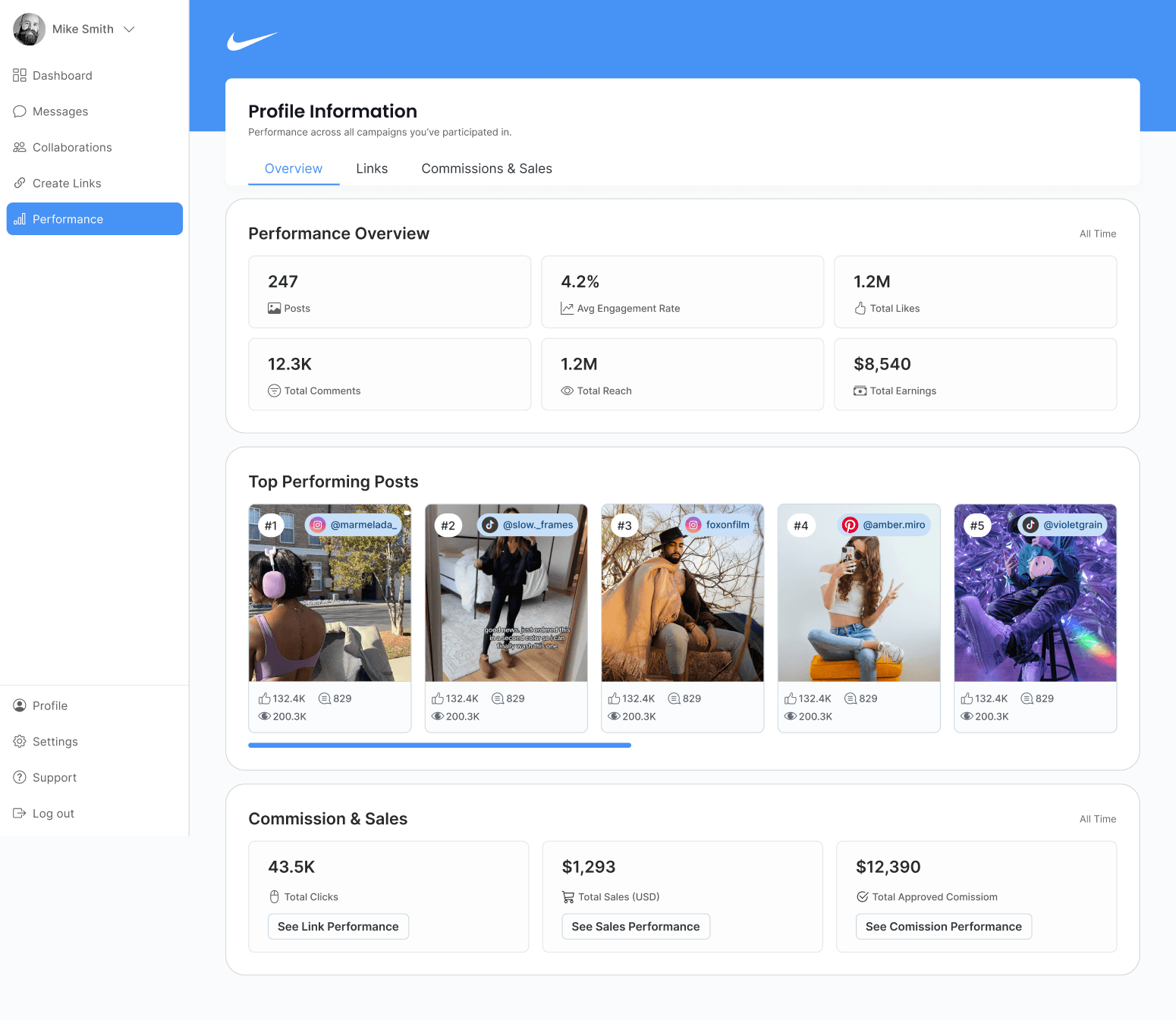 Creators land on the Overview page and immediately understand how they’re doing. Compact tiles show posts, engagement rates, reach, and total earnings for the selected period. The Top Performing Posts strip highlights five posts with quick stats. Two summary blocks guide deeper exploration—See Link Performance and See Sales Performance—providing a fast path from insight to action.